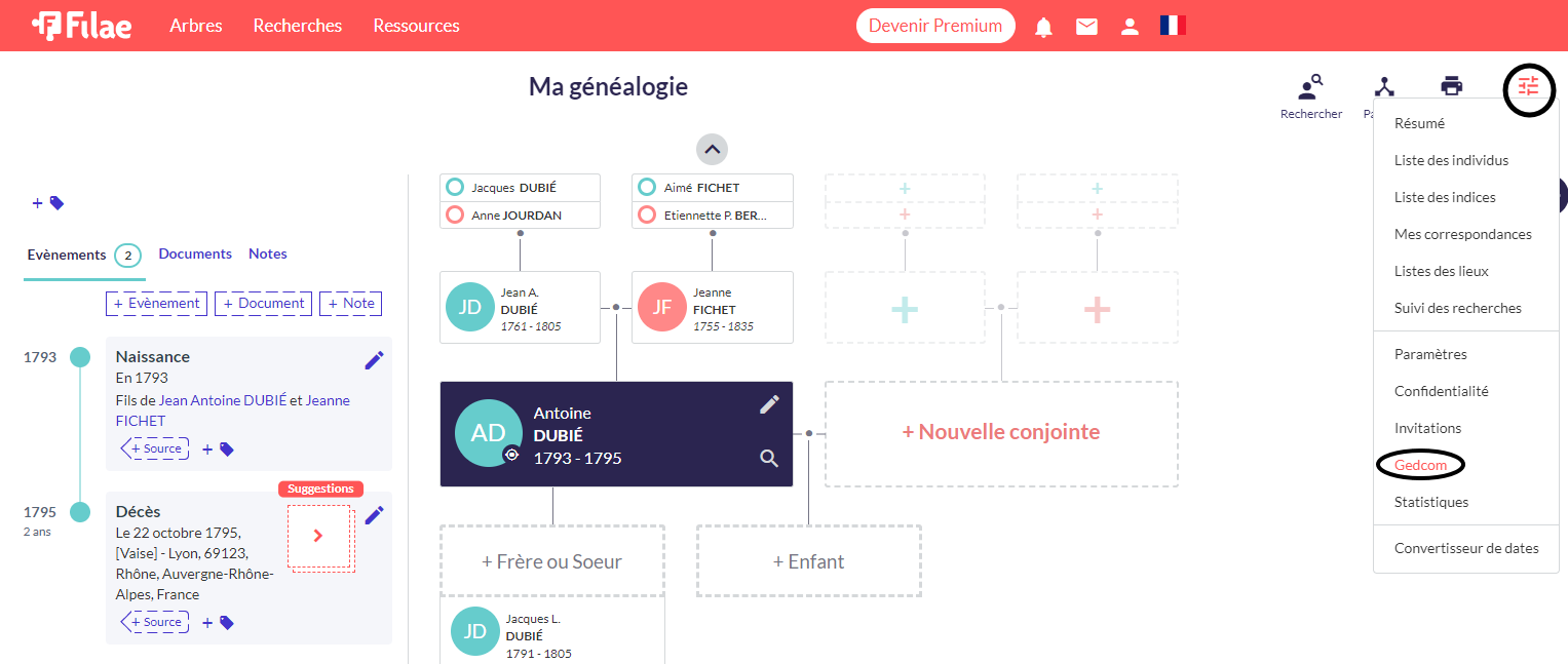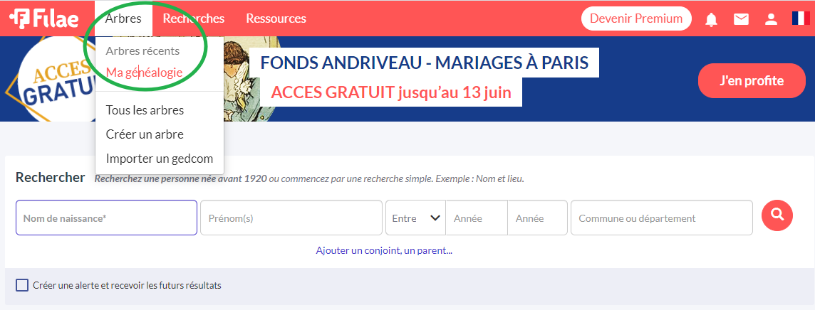 Lorsque vous êtes connecté à votre compte sur le site Filae cliquez sur le menu Arbres dans le bandeau supérieur, et sélectionnez le nom de votre arbre.