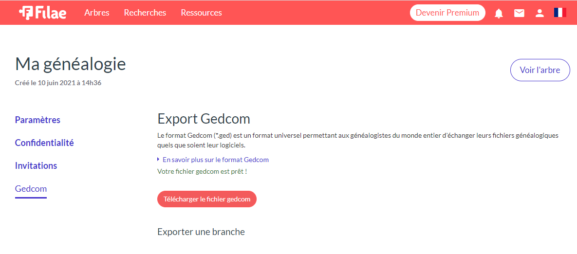 Cliquez ensuite sur Télécharger le fichier GEDCOM Dans le dossier de téléchargement de votre ordinateur, ce fichier porte le nom ExportGedcom suivi de la date complète du jour où vous avez réalisé l’export et de l’ heure précise.
