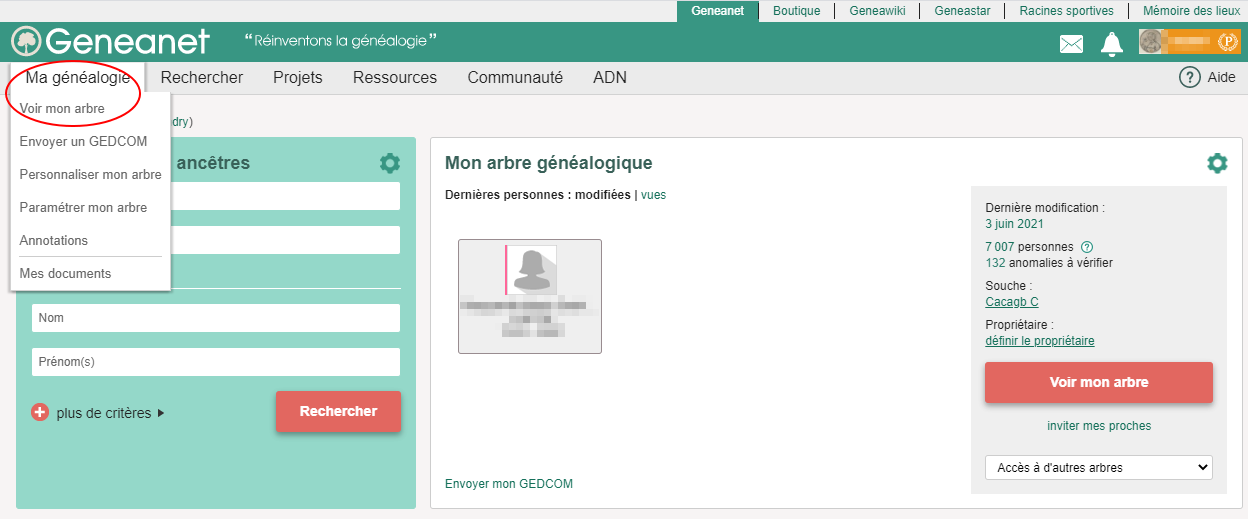 Cliquez sur Ma généalogie, et sélectionnez Voir mon arbre.