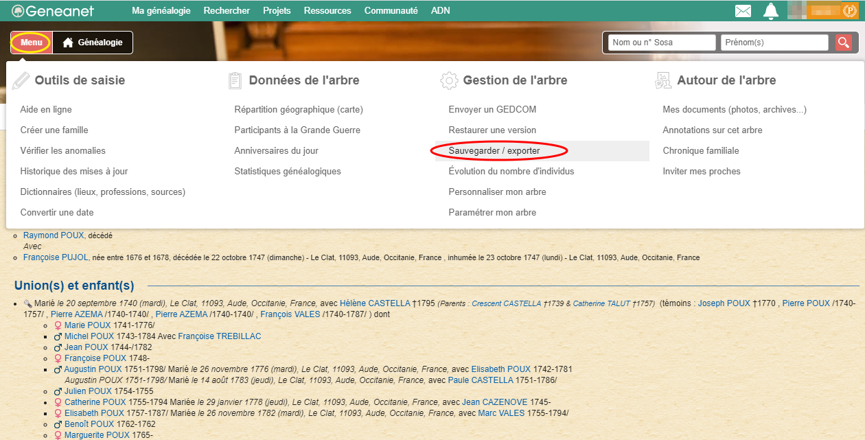Cliquez ensuite sur le bouton Menu dans la barre en haut à gauche, et dans la section Gestion de l’arbre, la troisième colonne, cliquez sur Sauvegarder / exporter, la troisième ligne. Vous arrivez alors sur la page de sauvegarde de l’arbre. Vous disposez de deux options : si vous avez importé votre généalogie sur ce site via un GEDCOM, vous pouvez télécharger le fichier d’origine ; dans tous les cas, vous pouvez récupérer votre arbre en ligne au format GEDCOM.