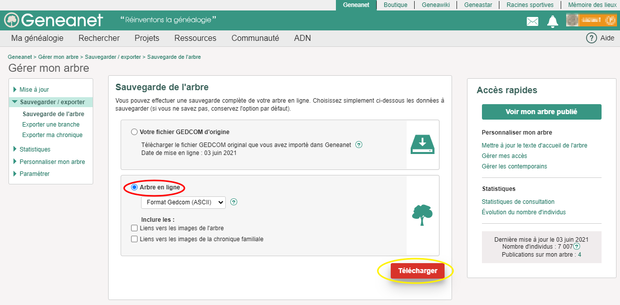Lorsque vous êtes connecté à votre compte sur le site de Geneanet, voici comment faire pour récupérer votre GEDCOM afin de l’importer dans Généatique.