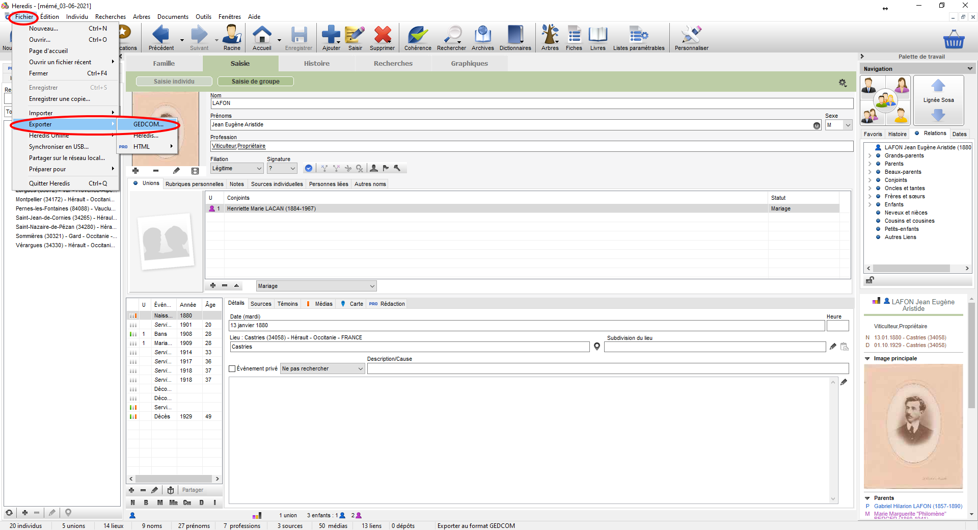 Si vous voulez importer votre généalogie depuis Heredis, ouvrez ce logiciel. Lorsque votre généalogie est à l’écran, cliquez sur le menu Fichier, tout en haut à gauche, puis sélectionnez Exporter / GEDCOM.
