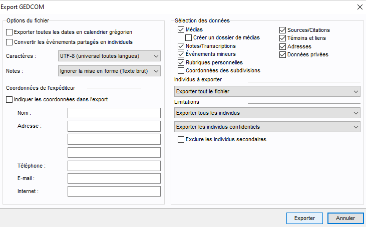 Le premier écran du paramétrage vous permet de choisir les informations qui vont se retrouver dans le jeu de com. Attention à bien cocher Médias, Sources, Témoins, et Notes, ainsi que tous les éléments que vous voulez retrouver dans votre généalogie sur Généatique.