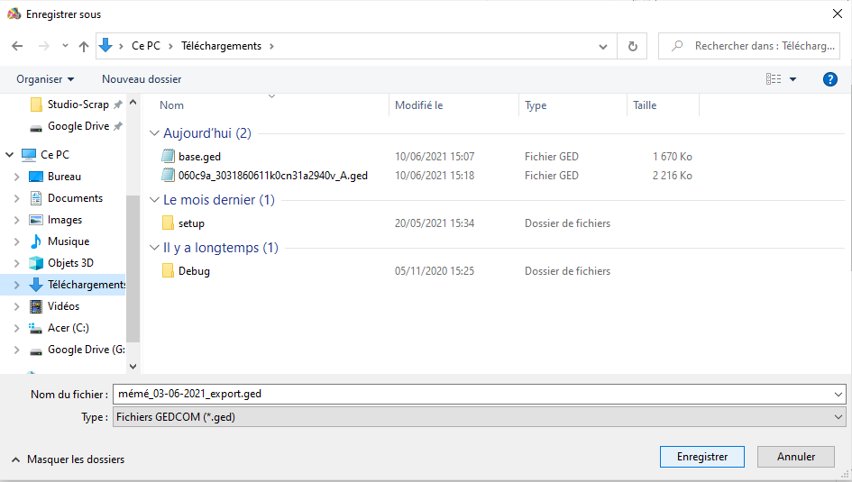 Une fois ces réglages terminés, cliquez sur Exporter. Dans la fenêtre qui s’ouvre, vous pouvez choisir le nom et l’emplacement du GEDCOM. Par défaut, le logiciel vous propose d’enregistrer le fichier dans le dossier où sont stockés les généalogies, en reprenant le nom du dossier, et la date du jour.