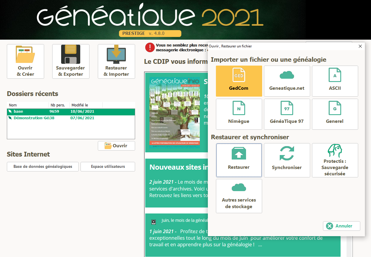 Une fois que vous avez récupéré le fichier GEDCOM de votre généalogie, c’est maintenant le moment de l’ouvrir dans Généatique. Pour cela, ouvrez le logiciel. Cliquez sur Restaurer et importer. Choisissez GEDCOM.