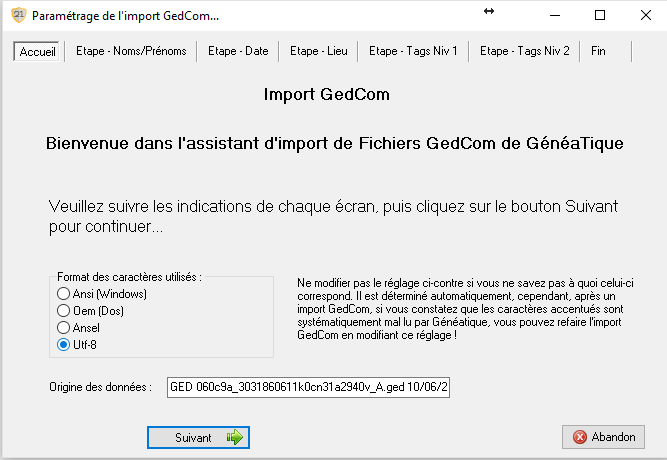 Après une première lecture du fichier, le logiciel vous propose un réglage pour l’import du fichier en choisissant le système de code du fichier. Si votre GEDCOM vient de Geneanet, Filae, ou Heredis, ne modifiez pas ce réglage. Pour un GEDCOM récupéré sur le site de MyHeritage, vérifiez que c’est bien l’encodage UTF-8 qui est sélectionné, et au besoin modifiez ce réglage.