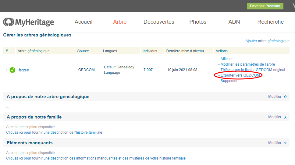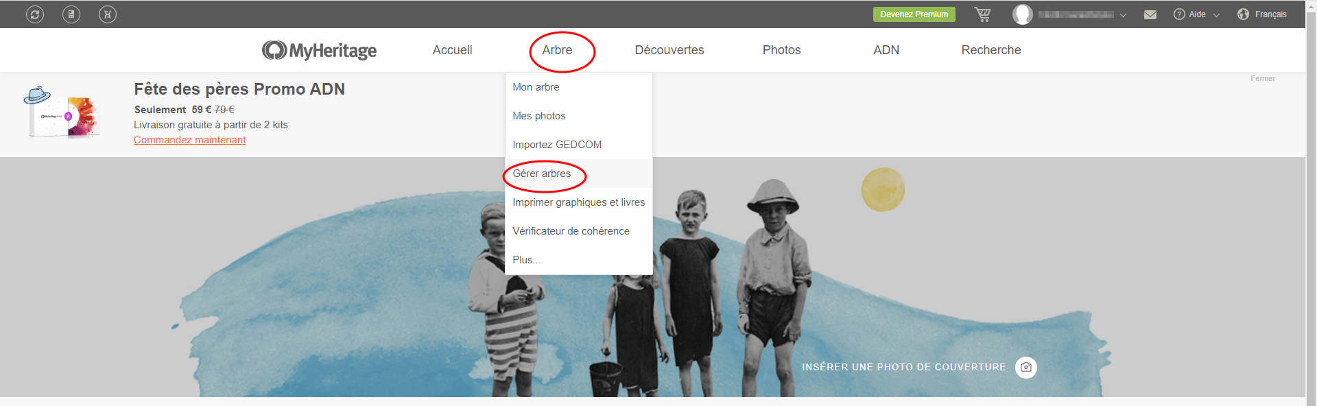 Si votre généalogie est sur le site MyHeritage, et que vous voulez l’installer dans Généatique, voici comment procéder : connectez-vous à votre compte sur le site MyHeritage. Dans les menus en haut de l’écran, cliquez sur Arbre, et sélectionnez le sous-menu Gérer arbres.