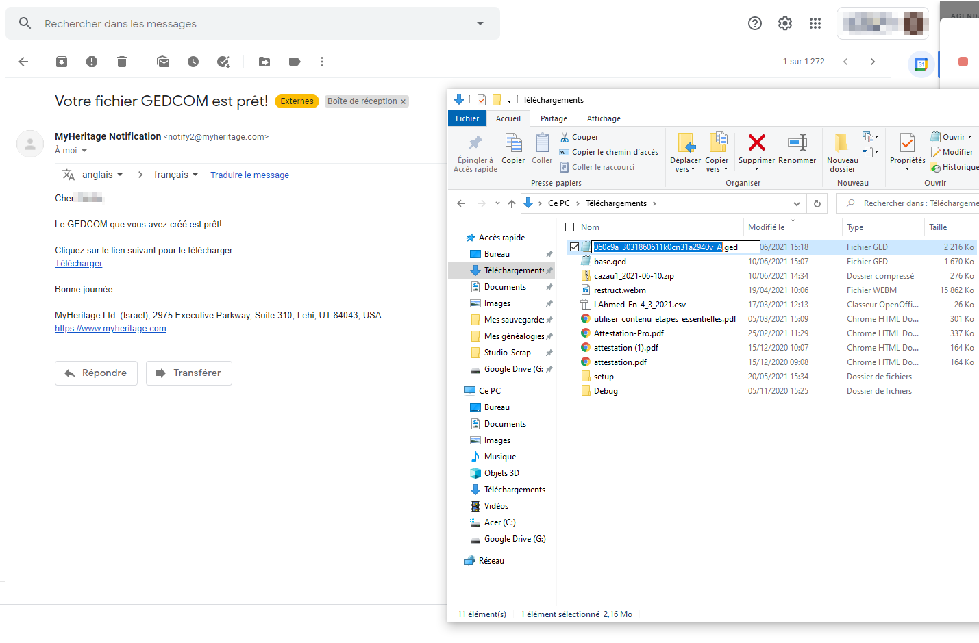 Cliquez sur Télécharger pour lancer l’opération. Dans le dossier des téléchargements de votre ordinateur, vous pouvez retrouver ce fichier. Il a bien une extension *.ged, caractéristique d’un fichier GEDCOM. Attention toutefois : son nom est une série de chiffres et de lettres. C’est pour cela que je vous conseille de le renommer dès qu’il est téléchargé, afin de pouvoir le retrouver plus facilement. Sélectionnez ce fichier, cliquez sur le bouton Renommer de votre ordinateur, et saisissez le nom de votre généalogie.
