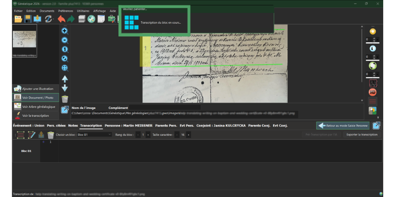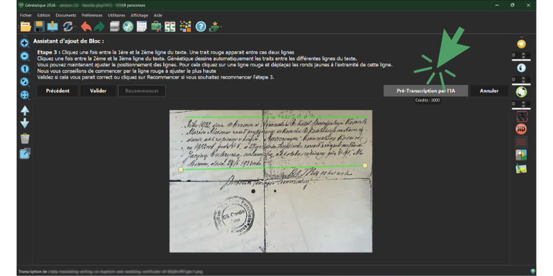 Une fois l’acte lisible à l’écran, vous allez demander à Généatique de déchiffrer l’écriture manuscrite et de la convertir en texte dactylographié (pré-transcription). Là-aussi, j’en ai parlé sur ce blog plusieurs fois déjà, et François le remontre dans toutes ses vidéos.