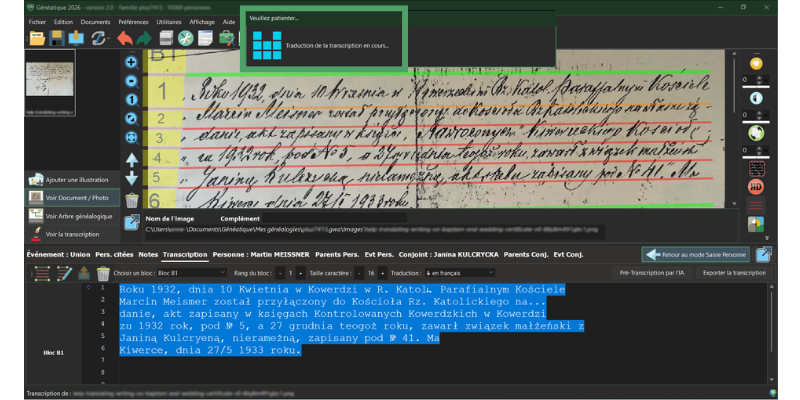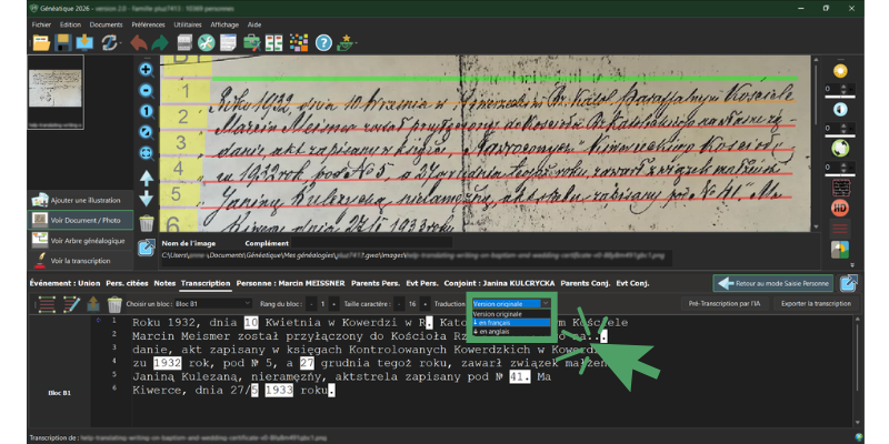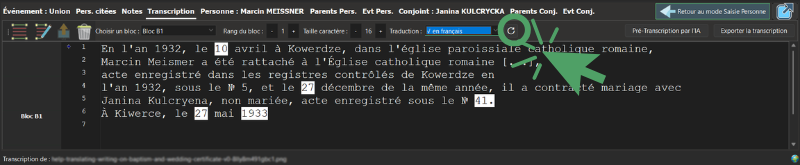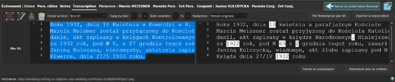 Si l’acte que vous venez de transcrire est dans une langue étrangère (comme le Latin ou l’Allemand gothique, mais moi, je vous montre du Polonais, comme souvent), vous pouvez maintenant le traduire directement dans l’interface :