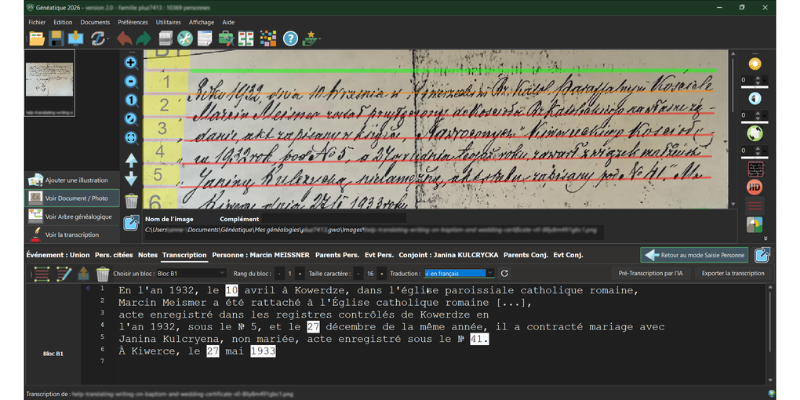 Généatique 2026, qui continue d’intégrer le meilleur de l’Intelligence Artificielle (IA), a renforcé ses capacités pour résoudre ce défi. Après avoir révolutionné la lecture des actes manuscrits avec la pré-transcription par IA l’an dernier, la nouvelle version ajoute désormais la traduction instantanée.