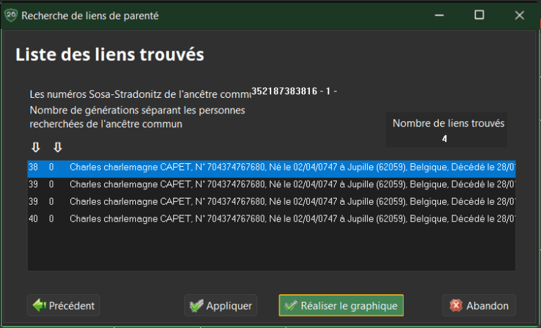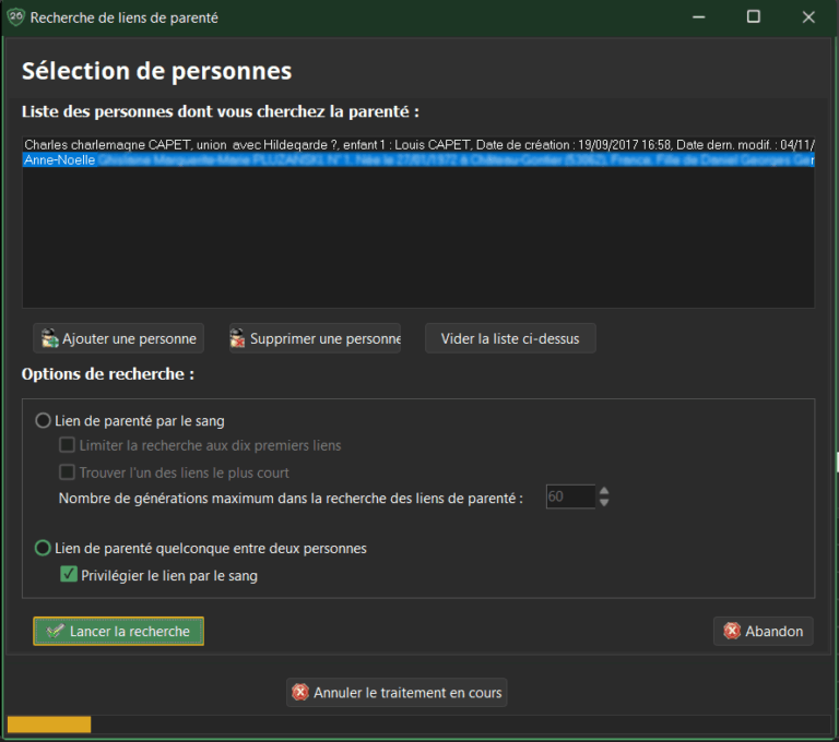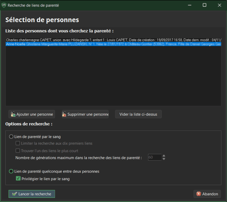 Sélectionnez ensuite dans la partie du haut les 2 personnes aux extrêmes, comme Charlemagne et moi… Et lancez la recherche !
