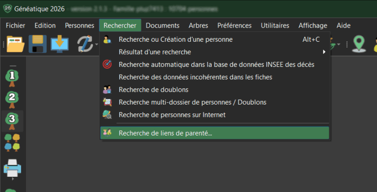 Commencez par amener l’écran de calcul de parenté : menu Rechercher puis Recherche de liens de parenté.
